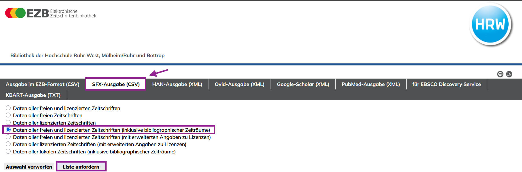 “Daten aller freien und lizenzierten Zeitschriften (inklusive bibliographischer Zeiträume)” - Click “Liste anfordern”